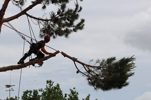 Celle-ci consiste à débiter l’arbre morceau par morceau. Si les contraintes sont trop grandes, nous pratiquons de la rétention qui consiste à descendre tous les morceaux un par un avec un système de cordage et de poulies.
