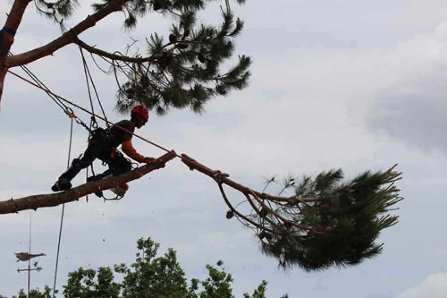 Nous utilisons cette technique d’abattage lorsque l'espace au sol est restreint et ne permet pas l'abattage de l’arbre directement au pied. Celle-ci consiste à débiter l’arbre morceau par morceau. Si les contraintes sont trop grandes, nous pratiquons de la rétention qui consiste à descendre tous les morceaux un par un en les retenant avec un système de cordage et de poulies.